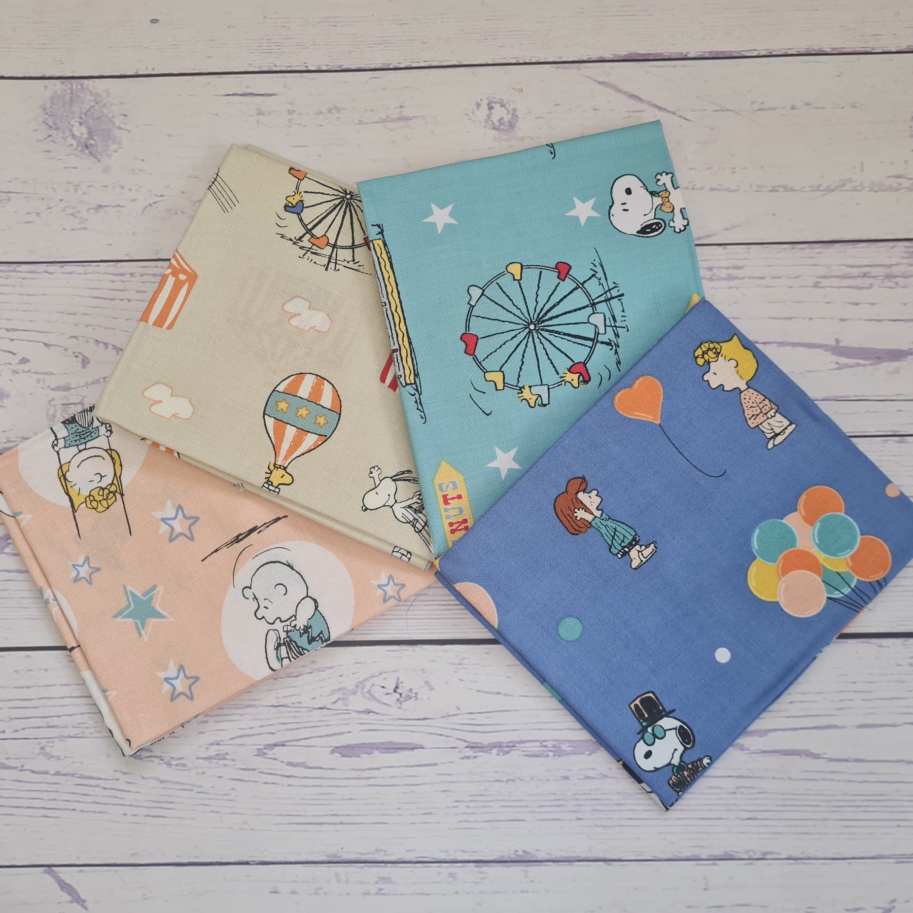 This cute fat quarter set displays cartoon characters from Charlie Brown, such as Snoopy and Peanuts at the circus, e.g. balloons, magicians, trapeze and the big wheel. Vintage blue/greens and natural colours.