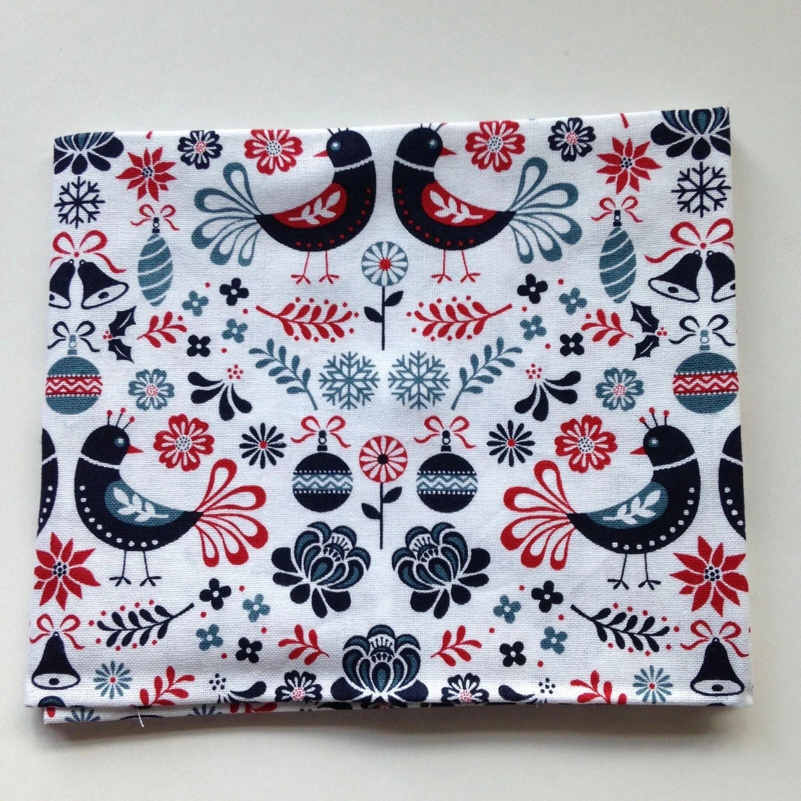 These red, grey and white fabrics feature Christmas trees, doves, hearts and reindeer in delightful Scandic designs